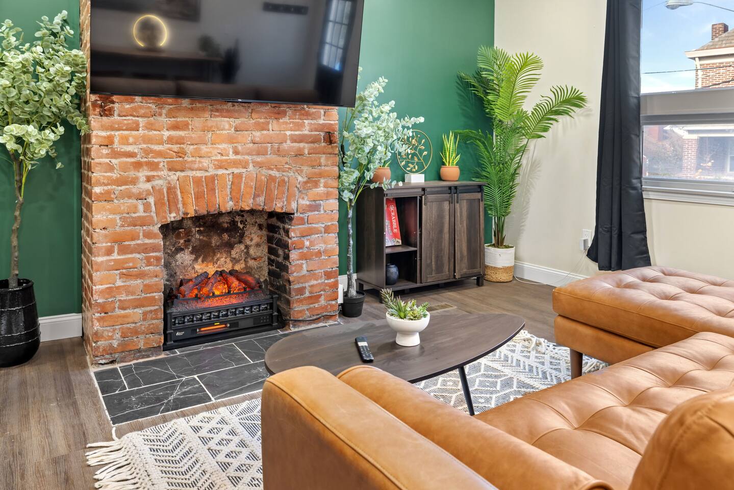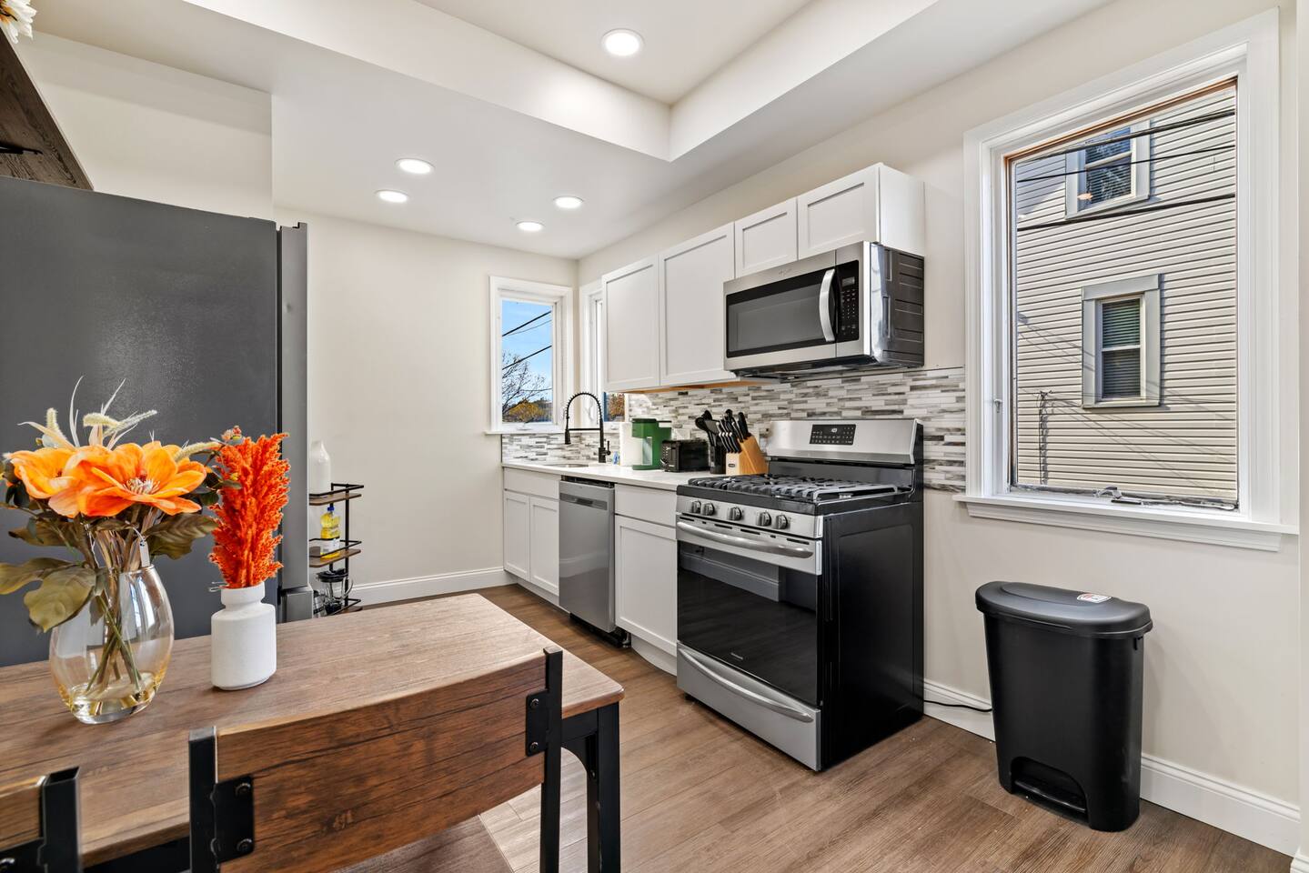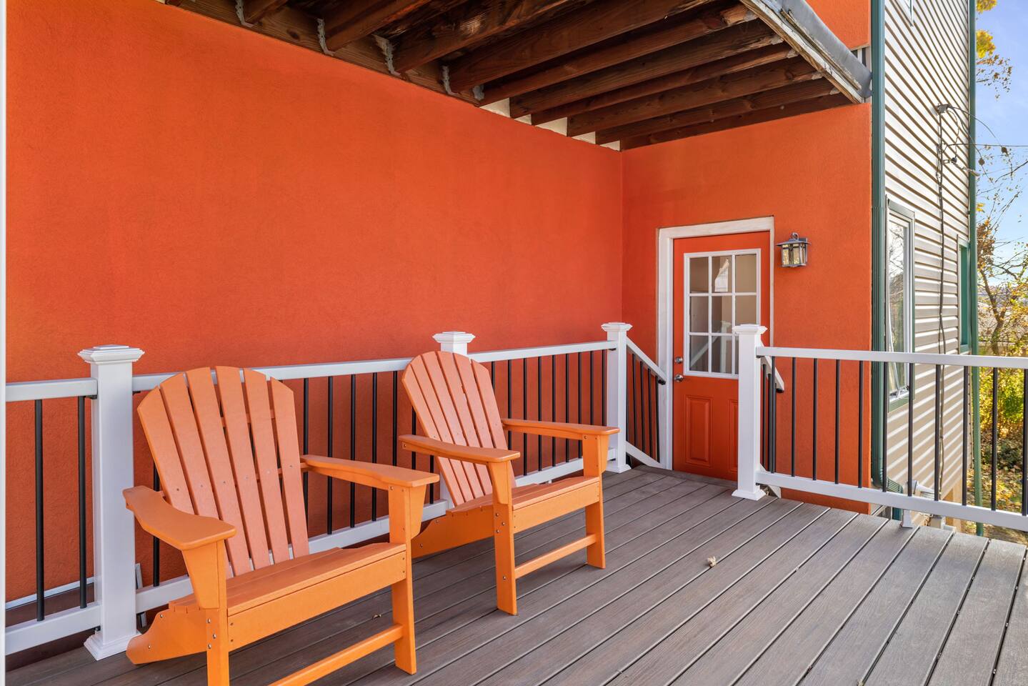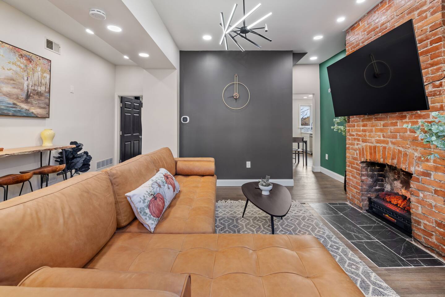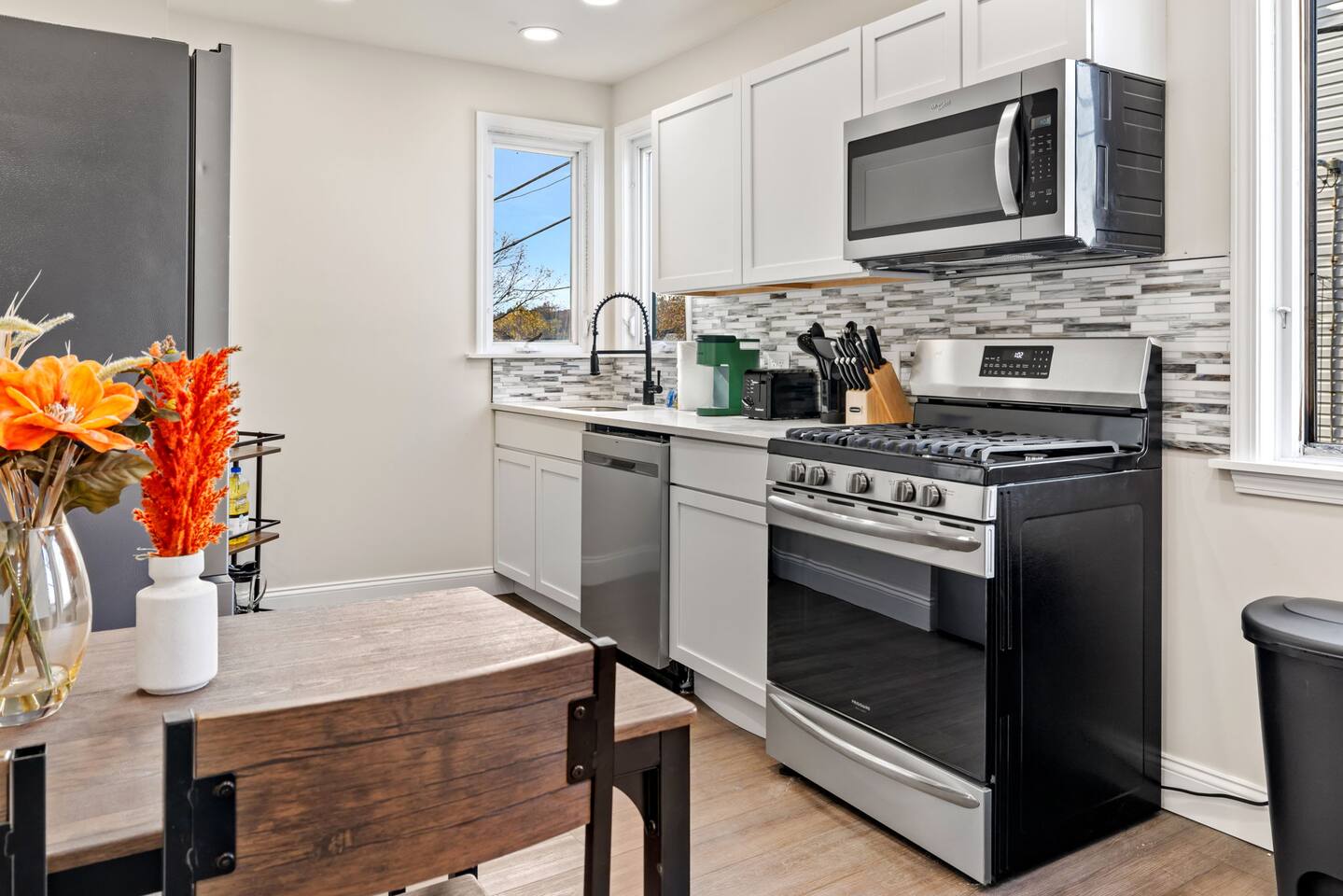 The home has 4 bedrooms and 3 bathrooms. It features three spacious bedrooms with a comfortable queen-sized bed, plenty of storage, and natural light. The fourth bedroom is very small and has a futon. The futon can sleep 2 people (it can sleep 2 people but not 2 large people). The bedrooms are thoughtfully designed with soft linens, plush pillows, and beautiful decorations! One bedroom is located on the first floor with a full ensuite bath, an adjustable fireplace, and an entrance to our side patio! The first upstairs bedroom contains an ensuite full bath and a mounted TV. The second upstairs bedroom has a cathedral ceiling and a jack-and-jill bath thats connected to a small room containing a futon. This small room is a great extra space to sleep for 2 small children or 1 teenager. The living room is furnished with a sofa to seat 3-4 adults, a coffee table and a flat-screen Roku TV. We also have 3 bar stools behind the couch for extra seating. Underneath the TV, we have an adjustable electric fireplace to add warmth and comfort during your stay! The kitchen is fully equipped with everything you need to cook delicious meals during your stay. You will find plenty of dishes, a keurig, cookware, a fridge, and a microwave. The bathrooms are sparkling clean and modern, providing all the comforts you need during your stay. Two of the bedrooms have ensuite full baths! The third bedroom with a cathedral ceiling and the smaller bedroom with a futon share a jack-and-jill full bath! The house also offers high-speed internet, air conditioning, and heating. Off of the kitchen is the doorway out to the deck. We have 2 orange chairs on the deck to enjoy time outside! The laundry machines are located in our basement which is unfinished.