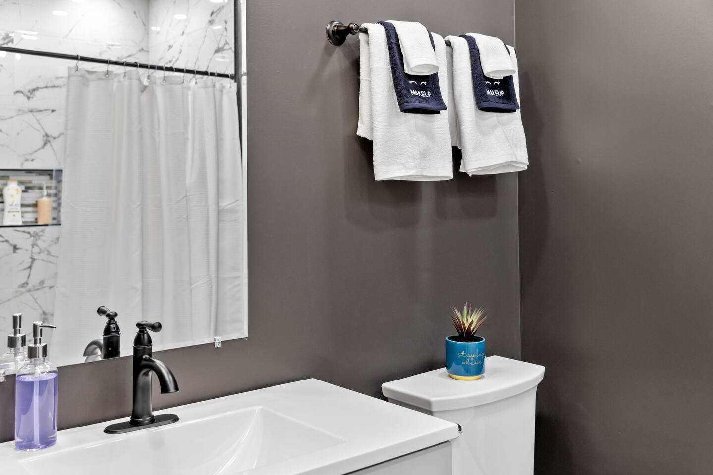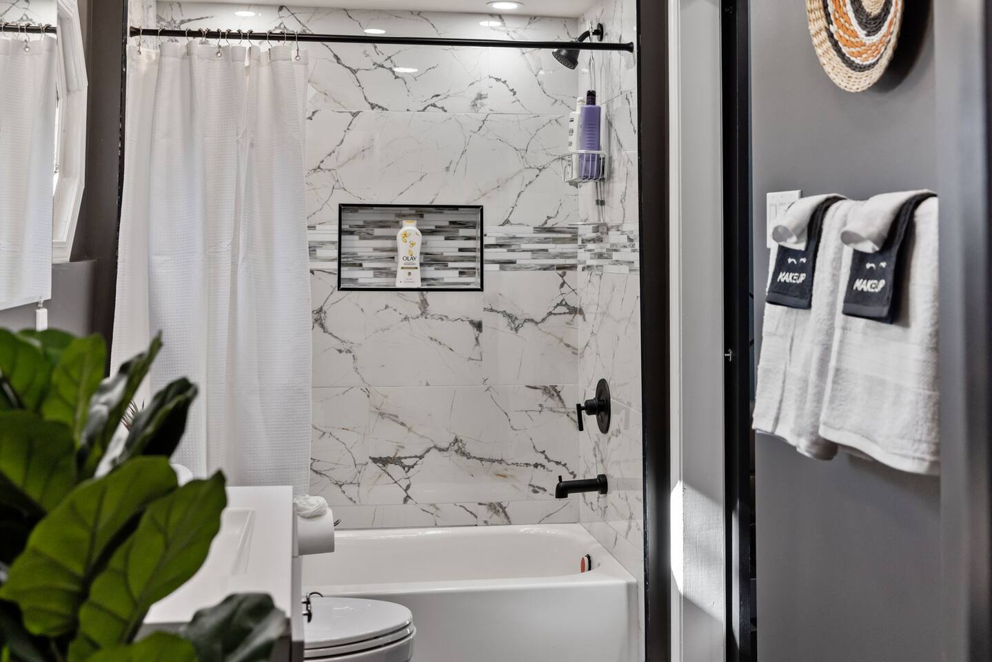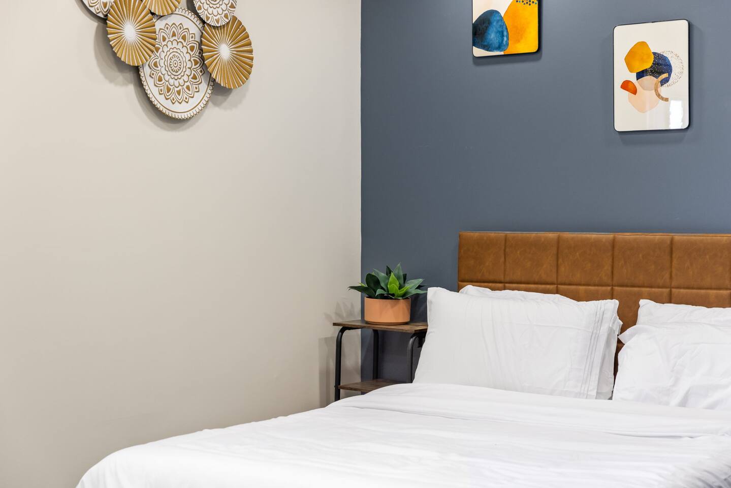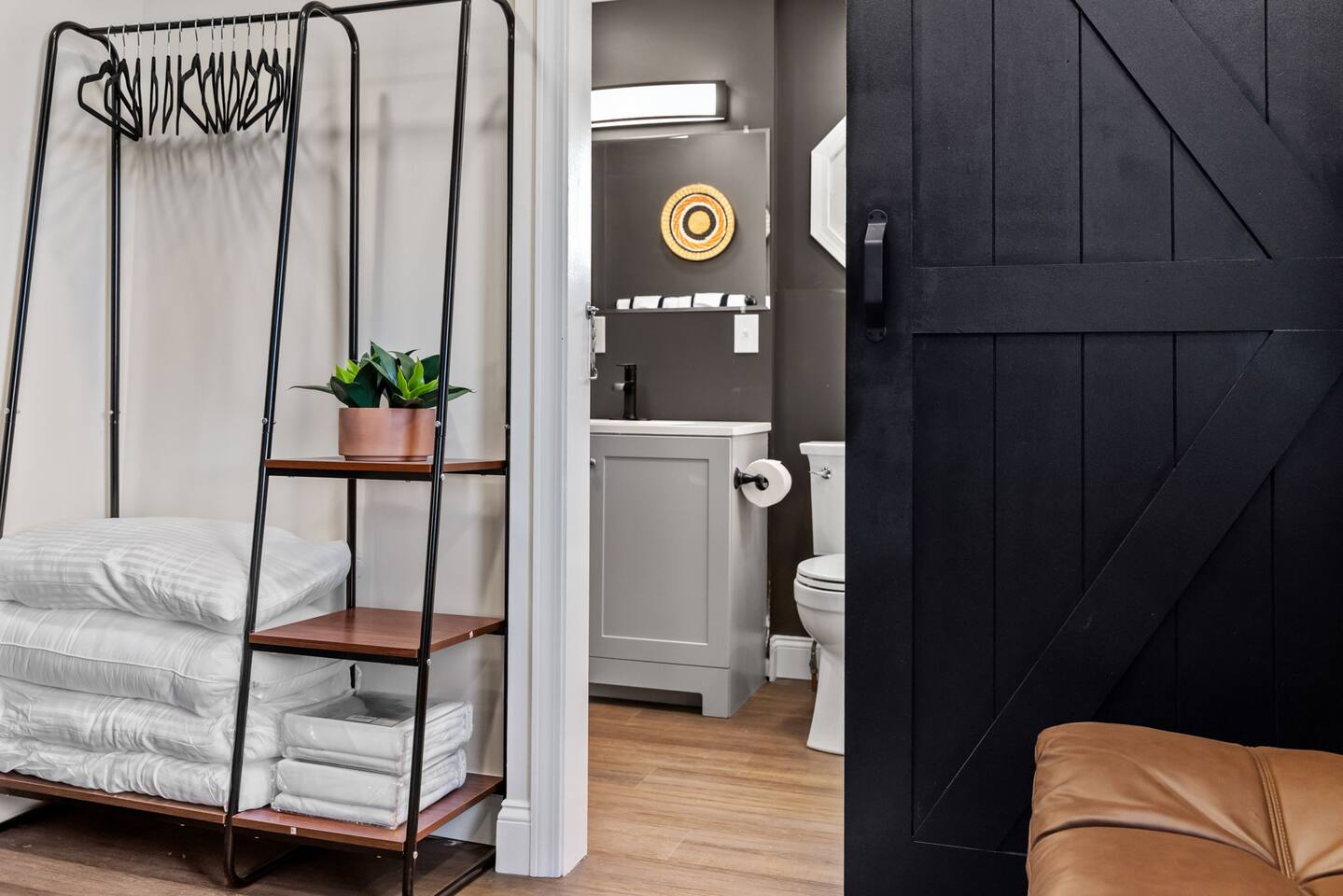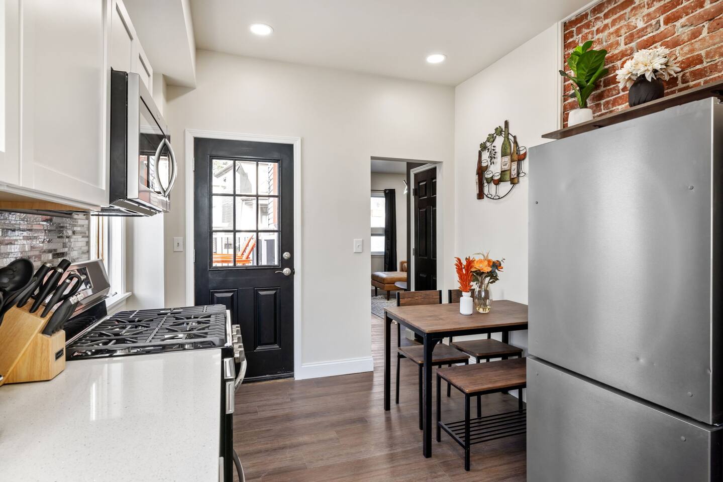 The home has 4 bedrooms and 3 bathrooms. It features three spacious bedrooms with a comfortable queen-sized bed, plenty of storage, and natural light. The fourth bedroom is very small and has a futon. The futon can sleep 2 people (it can sleep 2 people but not 2 large people). The bedrooms are thoughtfully designed with soft linens, plush pillows, and beautiful decorations! One bedroom is located on the first floor with a full ensuite bath, an adjustable fireplace, and an entrance to our side patio! The first upstairs bedroom contains an ensuite full bath and a mounted TV. The second upstairs bedroom has a cathedral ceiling and a jack-and-jill bath thats connected to a small room containing a futon. This small room is a great extra space to sleep for 2 small children or 1 teenager. The living room is furnished with a sofa to seat 3-4 adults, a coffee table and a flat-screen Roku TV. We also have 3 bar stools behind the couch for extra seating. Underneath the TV, we have an adjustable electric fireplace to add warmth and comfort during your stay! The kitchen is fully equipped with everything you need to cook delicious meals during your stay. You will find plenty of dishes, a keurig, cookware, a fridge, and a microwave. The bathrooms are sparkling clean and modern, providing all the comforts you need during your stay. Two of the bedrooms have ensuite full baths! The third bedroom with a cathedral ceiling and the smaller bedroom with a futon share a jack-and-jill full bath! The house also offers high-speed internet, air conditioning, and heating. Off of the kitchen is the doorway out to the deck. We have 2 orange chairs on the deck to enjoy time outside! The laundry machines are located in our basement which is unfinished.