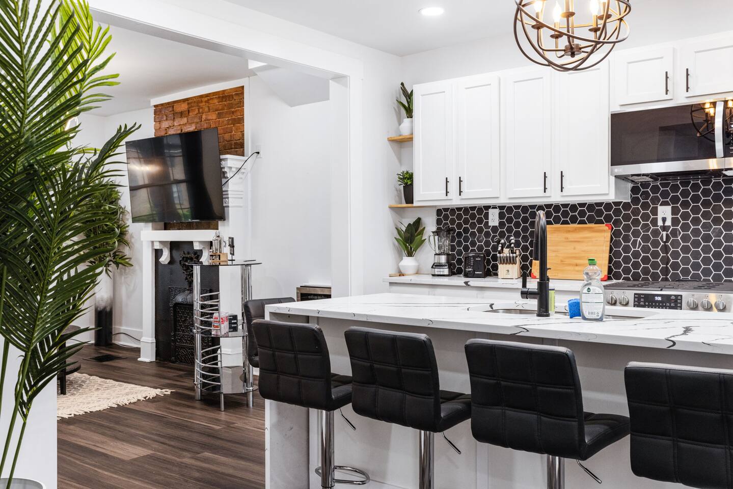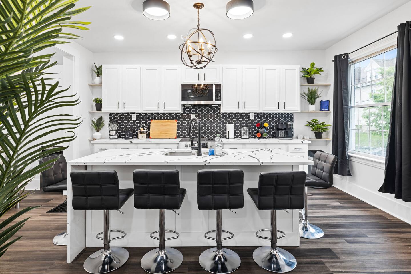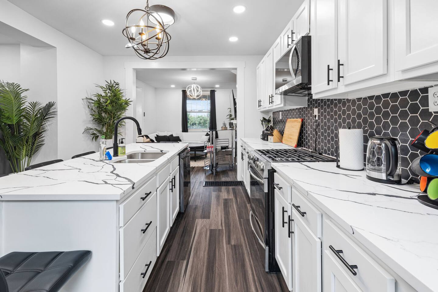 Our home features a spacious living room with comfortable seating from Crate & Barrel, perfect for curling up with a good book or relaxing with friends and family. The fully equipped kitchen with a stunning island and Quartz countertop is perfect for cooking delicious meals and is stocked with all the appliances and cookware you need to make yourself at home. On the second floor, there are 2 bedrooms with queens beds. Both of these bedrooms have admirable on-suite full baths! The third floor has 2 bedrooms with queens beds and a bath for them to share is on the second floor. Our house is the ideal setting for your family to stay!