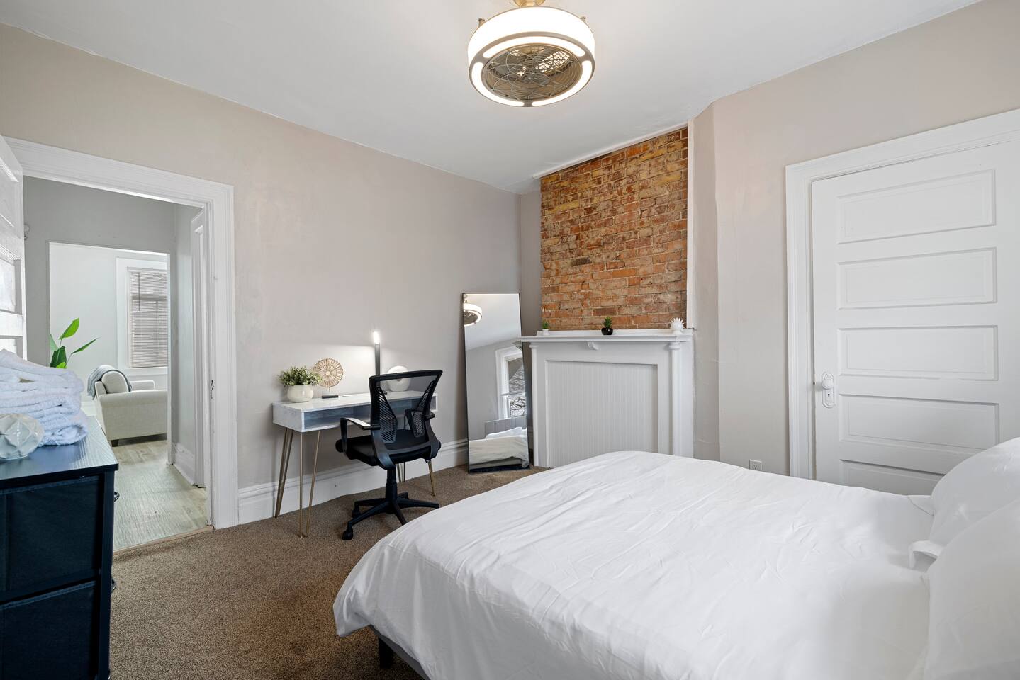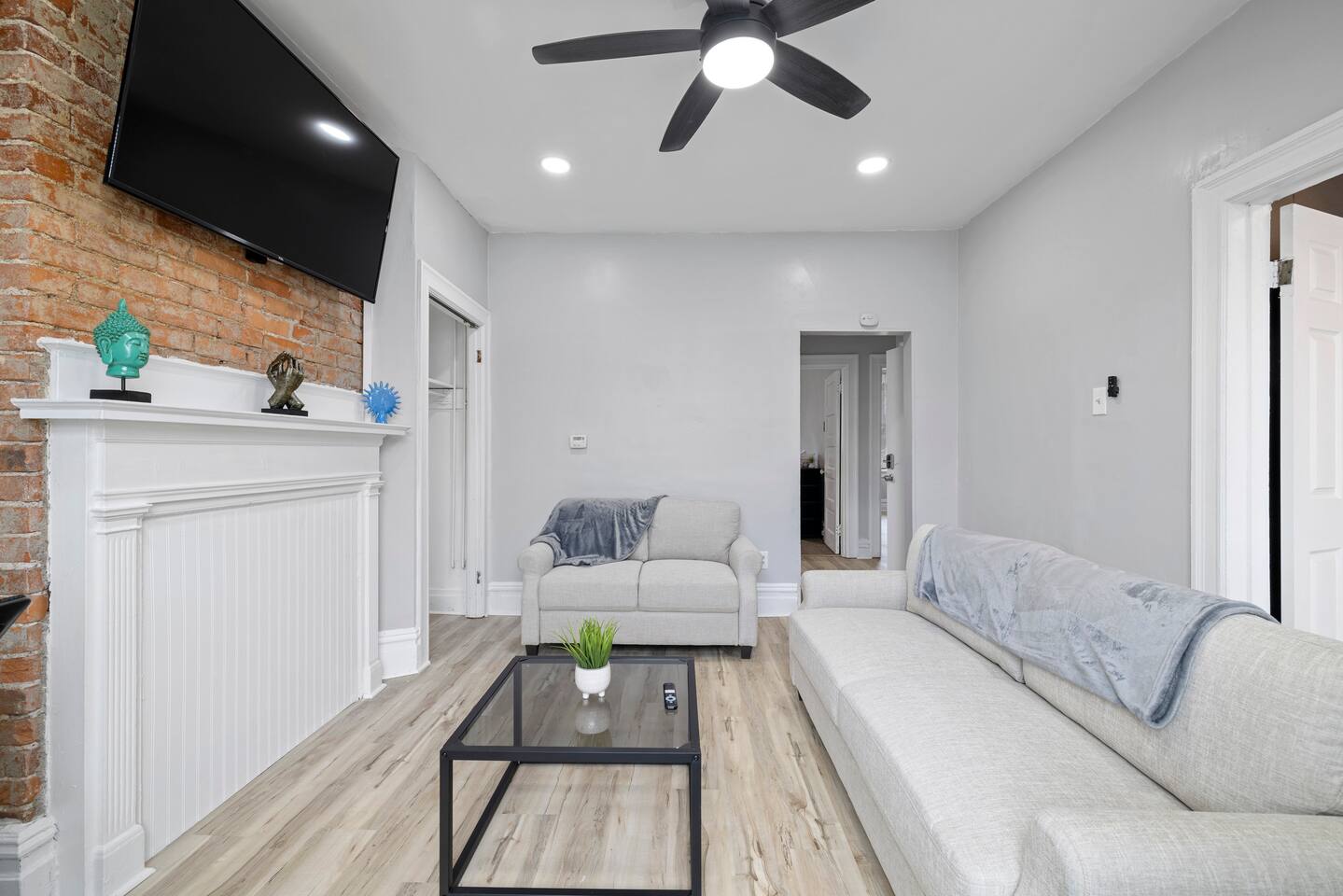 This apartment is on the second floor of our home, which is a 3 story triplex. Inside we have 1 Queen Bed! Our kitchen is full with dishware, utensils, and different cooking supplies. Smart TV with Roku, closet space, and plenty of living room seating offers all the basic perks & amenities for a couple. With comfy furnishings & personal touches, this is a great place to lay your head after a day of city life!